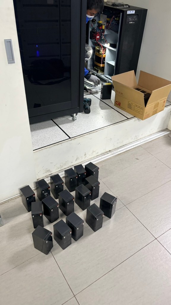 這兩台大型 UPS 系統近期皆出現了「電池更換警示燈(跳燈)」的狀況。這意味著內部的鉛酸電池壽命已盡,若發生無預警停電,UPS 將無法提供足夠的備用電力,可能導致伺服器異常關機與資料遺失。客戶察覺風險後,立刻聯繫泓統資訊前往現場處理。